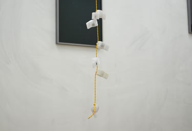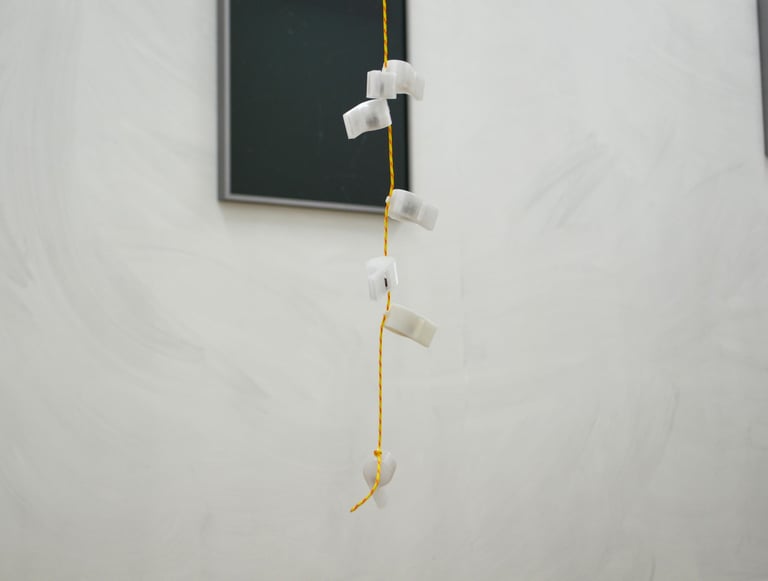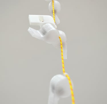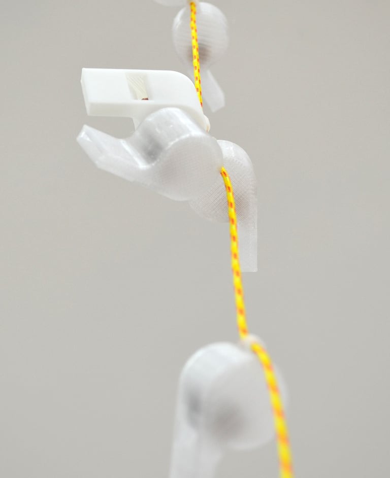 3D printed whistles, cork bark, seeds (pūriri, nīkau, mānuka), rope