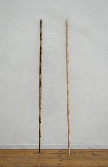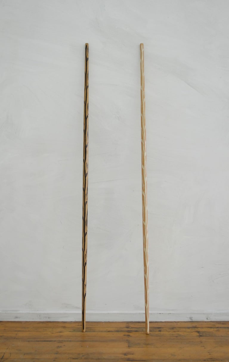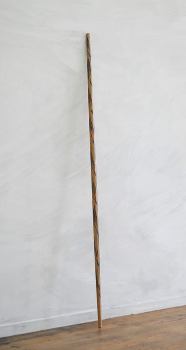 Hand-planed and carved American white oak, charcoal, gesso, epoxy resin, made to the dimensions of an Okinawan karate bō staff, ornamented with sub-antarctic bladder kelp
