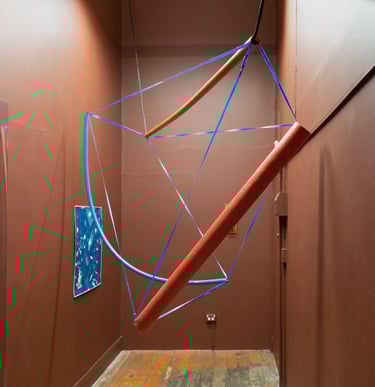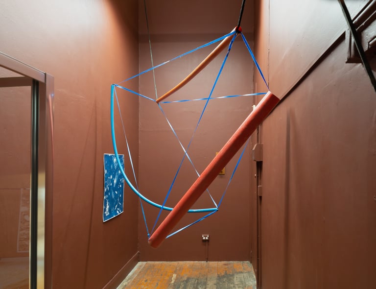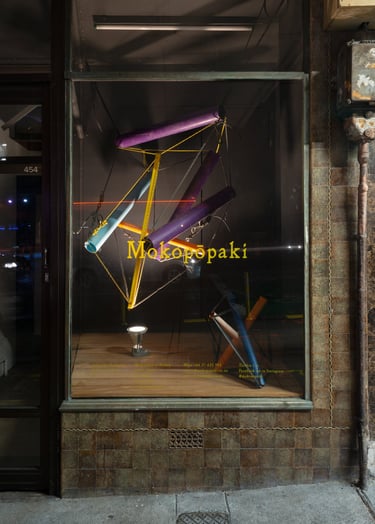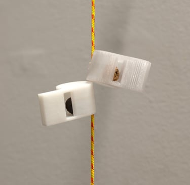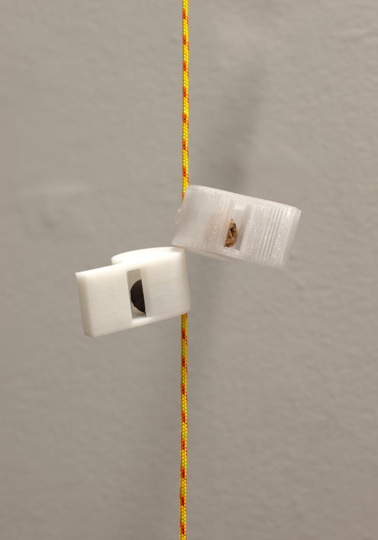 3D printed whistles, cork bark, seeds (pūriri, nīkau, mānuka), rope