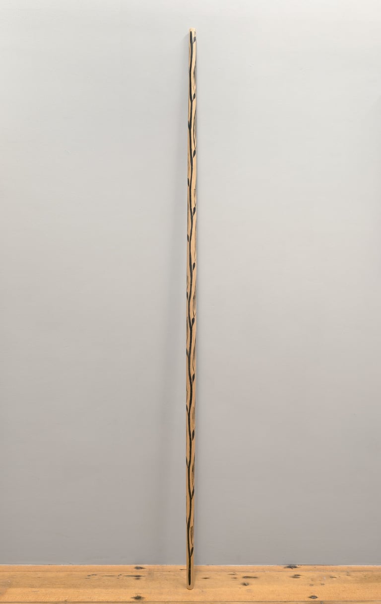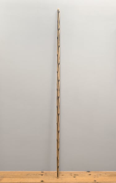 Hand-planed and carved American white oak, charcoal, gesso, epoxy resin, made to the dimensions of an Okinawan karate bō staff, ornamented with sub-antarctic bladder kelp