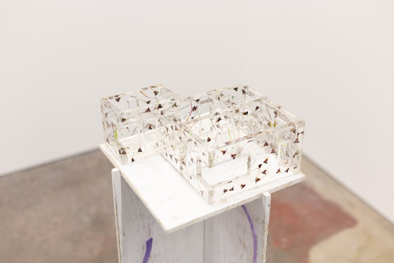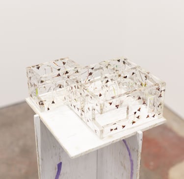 Pressed dried flowers and food wrappers collected from the hedge outside Frank Sargeson's house, resin, painted plywood