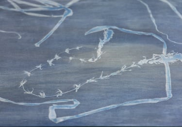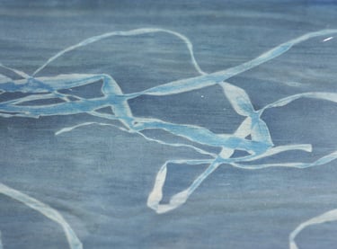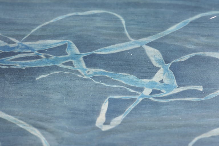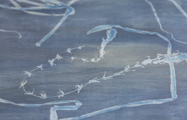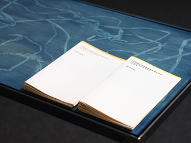 Table (by Eleanor Cooper), cyanotype on plywood, glass, steel