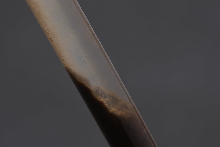 Sample of lake water from Pupuke Moana including algal bloom sediment, vinyl tube, string